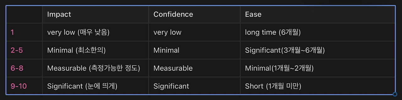 여기서 Reach는 영향을 받는 유저의 수로, Impact는 유저나 비즈니스에 가져다 줄 긍정적인 효과의 크기다.
