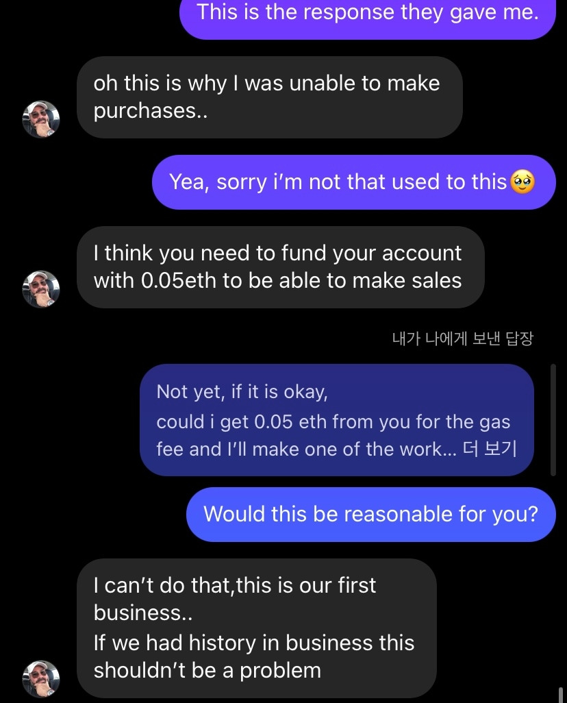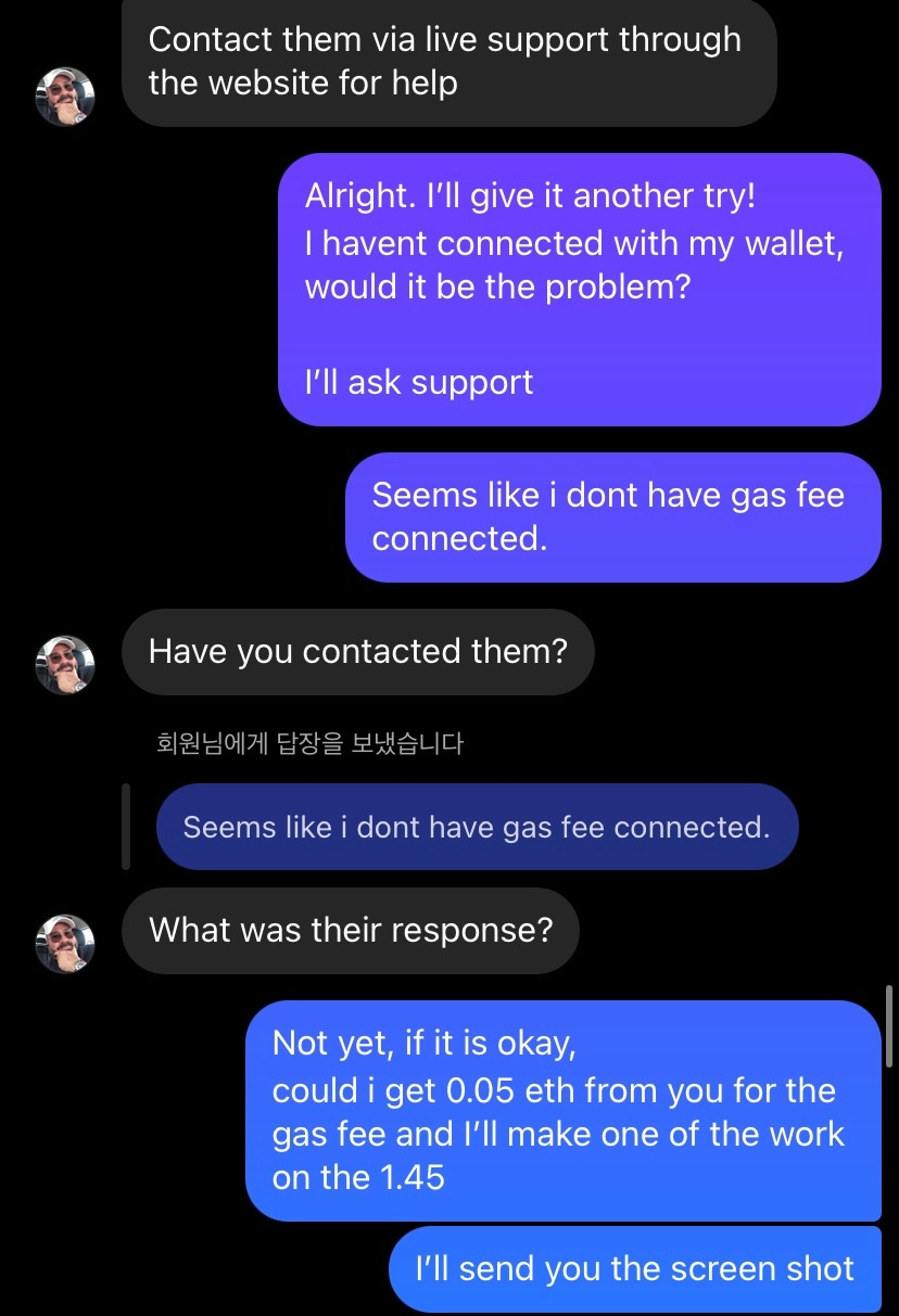 커스터머 서포트에 연락을 해보니 거래를 할 때의 가스비 (수수료)가 부족하다 했다. 나한테도 0.05 이더리움의 가스가 사이트에 충전이 되어있어야 한다며. 검색하니 약 100달러.