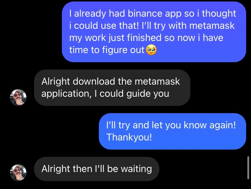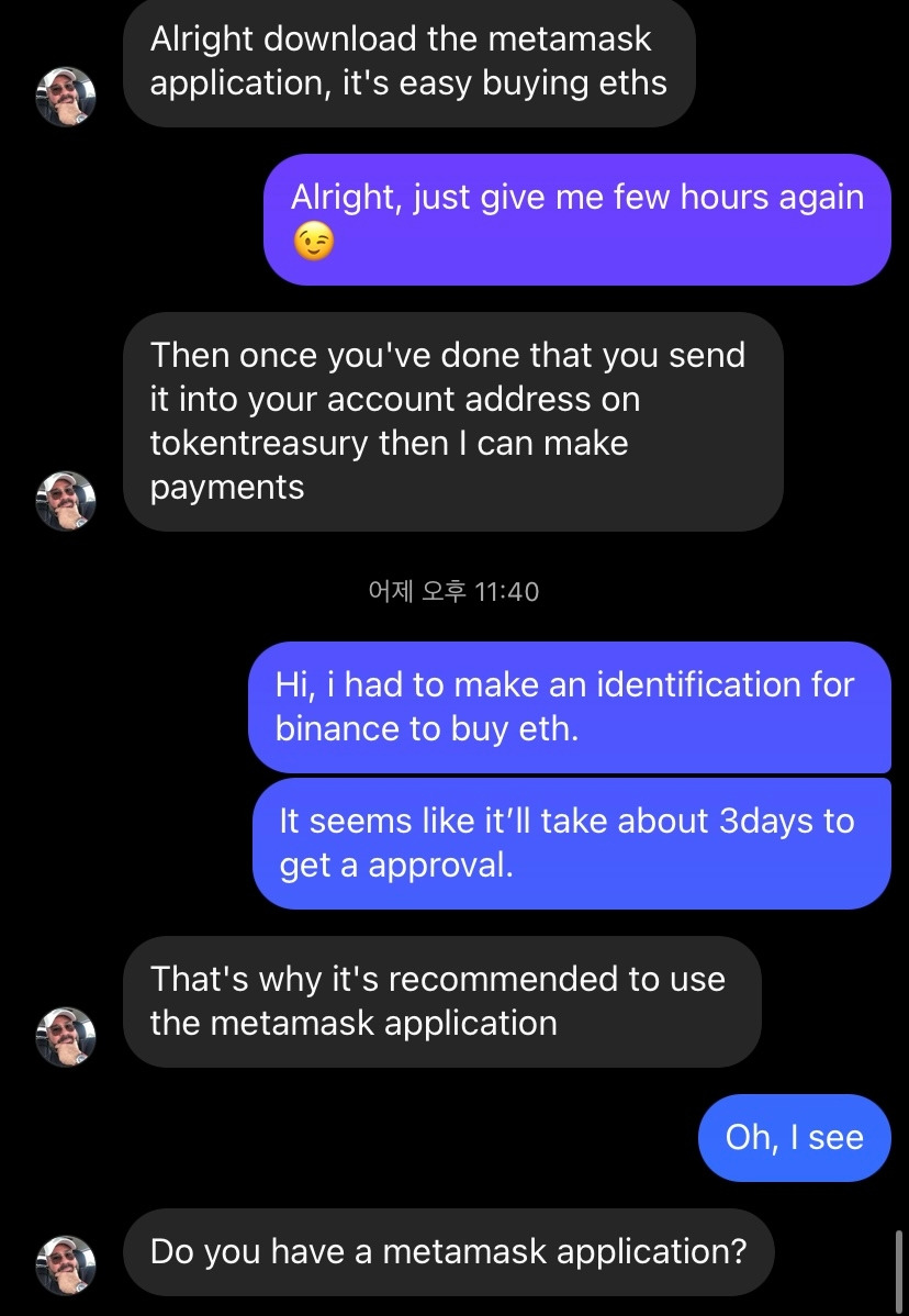 그리고 메타마스크를 연결시켜 이더리움을 구매하고 넣고 나서 다시 연락하라고 했다. 메타마스크보단 바이낸스가 이미 계정이 있었지만, 본인확인은 안되어있어서 본인확인 신청을 하고, 3일이 걸린다 해서 그렇다고 알려줬다.