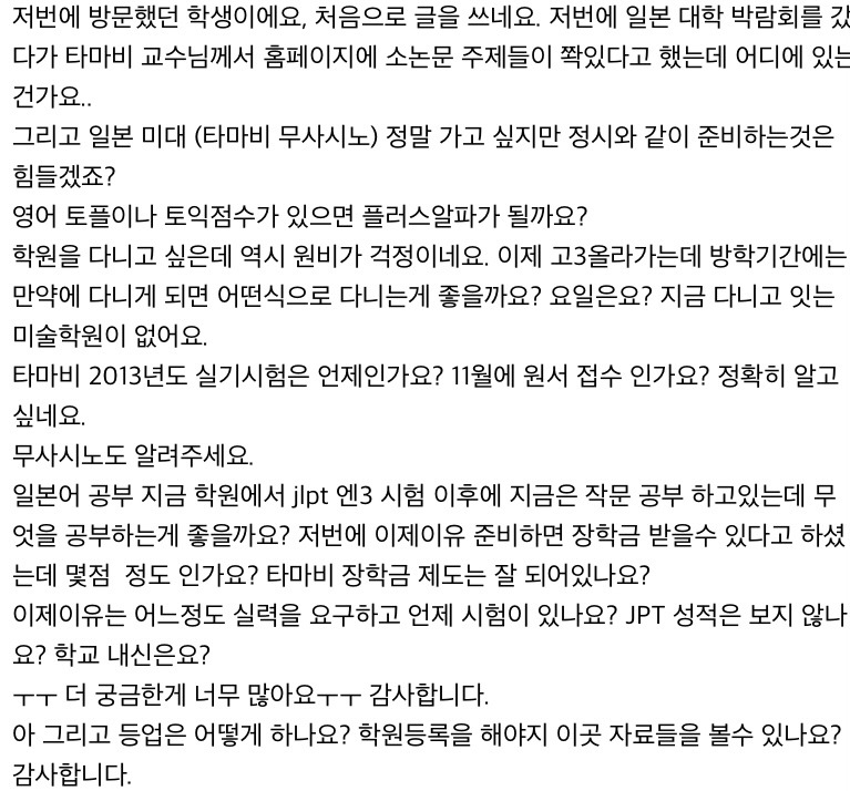 언어가 안되는데 어떡하죠? 어디서부터 어떻게 시작해야 할지 감이 안 잡혀요.. 학원은 어디를 다녀야 하죠?라는 질문을 가끔씩 받곤 했다. 일본 유학을 생각했을 땐 나도 무작정 ‘일본 미대 입시 학원’을 검색하고 돌아다녔었다. 학원 카페에 11년 전, 너무 답답해서 적어나갔던 질문들이 아직도 카페글에 남아있어 아래에 갖고 와봤다. 이제는 하나하나 내가 다 답 할 수 있는 것들 아닐까?