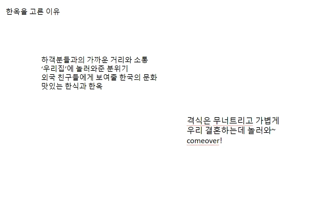 우리의 결혼식에 오기 위해, 한국에 처음 오는 친구들이 아주 많았다. 그래서, 우리는 한옥을 무대로 골라 야외에서 식을 진행하기로 했다. 아래는 결혼 준비당시 한옥을 고른 이유에 대해서 적어놓았던 페이지다.