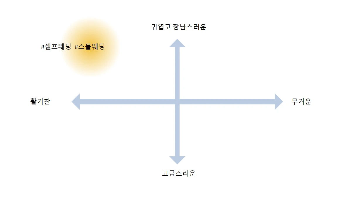 그럴 때일수록 축을 잘 정해놔야 정신줄을 되잡고, 길을 잃지 않고 초심으로 다시 돌아갈 수가 있다. 인테리어디자인에서도 많이 사용되는 방법인데, 4 분할 메트릭스를 그려, 내가 생각하는 상반되는 분위기와 글을 적고, 우리가 원하는 분위기를 골라, 축을 만들며, 다시 나에게 물어봤다.
