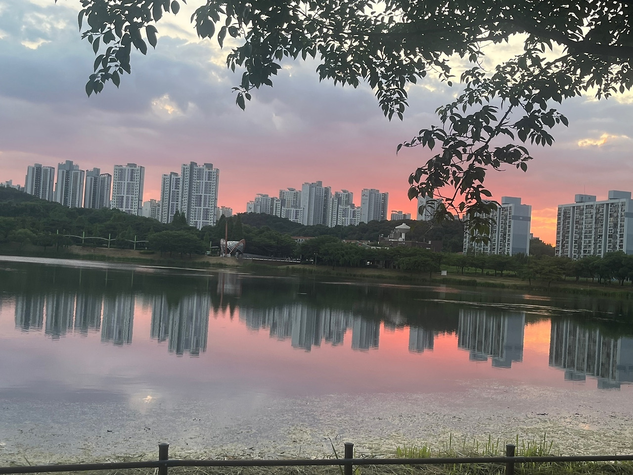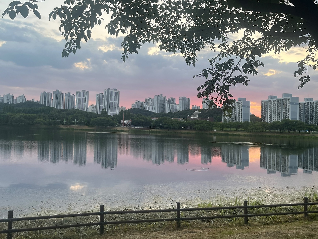 공원을 걷다가 벤치에 앉아서 호수에 비친 아름다운 노을을 보다가,