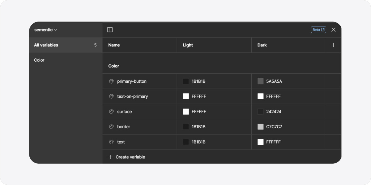 mode의 이름을 Dark로 바꾸고 다크모드에 쓰일 색들을 새로 지정하면 프레임의 모드에 따라 색상이 자동으로 바뀌는 컴포넌트 만들기는 끝이 납니다.