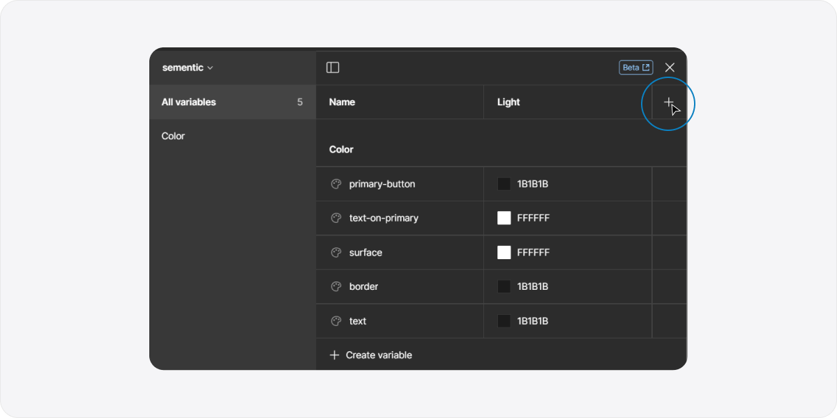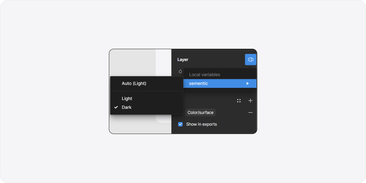 우측 패널의 레이어 섹션에 새로 생긴 버튼을 눌러 모드를 Dark로 지정합니다. 버튼은 프레임의 속성에 변수가 포함이 되어 있어야 보입니다.