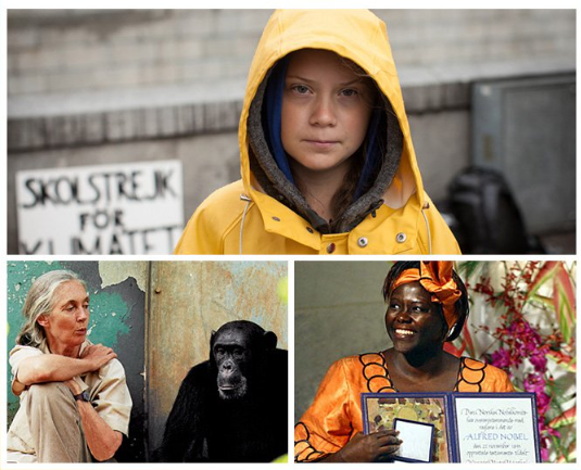 시계방향으로 그레타 툰베리, 왕가리 마타이, 제인 구달