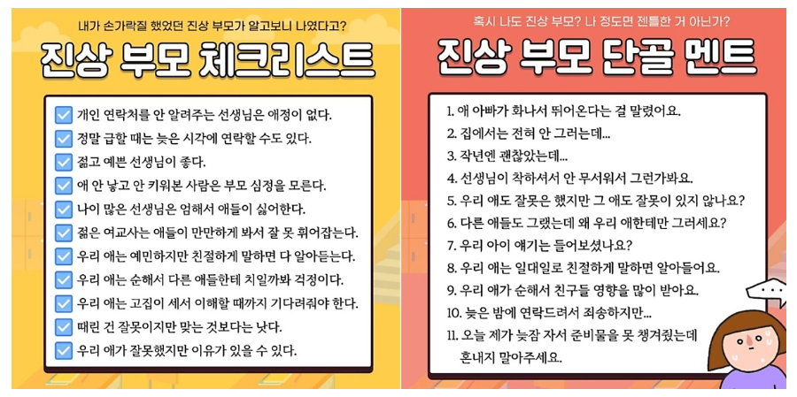 서이초 사건을 기점으로 교사 업무 영역과 업무 시간에 대해 굉장히 조심스럽게 접근하는 사회분위기가 조성되었다고 생각한다. 온라인 커뮤니티에 종종 올라오는 ‘제가 진상 학부모인가요?’라는 질문에는 ‘그럴 수 있지’, ‘그게 바로 갑질이네’가 오고 가며 엄청난 댓글이 달린다. 결국 ‘진상 부모 자가 체크리스트’가 돌면서 대한민국 학부모들에게 ‘내가 알게 모르게 했던 행동들이 교사들을 의도치 않게 힘들게 하진 않았는지’ 되돌아보는 자기반성의 시간을 선사하기도 했다.