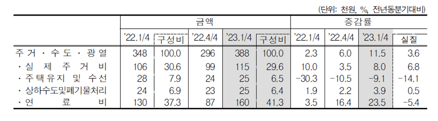 월세와 같은 실제 주거비 자체는 전년 대비 8%가량 증가했으나, 수선 및 유지 비용은 감소했다.