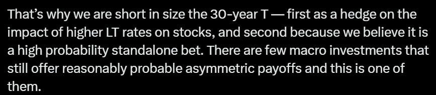 "난 30년 만기 채권에 숏을 쳤다. (가격 하락에 베팅했다.) 첫번째 이유는 이 장기채 금리가 내 주식에 미치는 영향 때문이고, 두번째 이유는 이것 그 자체로도 훌륭한 베팅이기 때문이다."