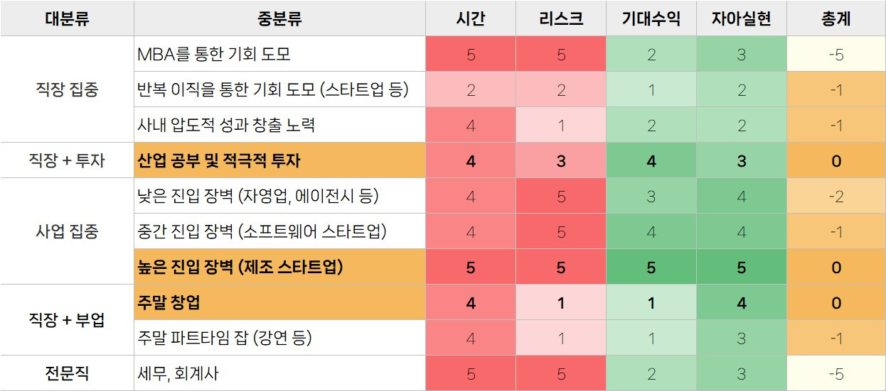 * 시간/리스크는 Negative 요인(-), 기대수익/자아실현은 Positive 요인(+)으로 계산했다.