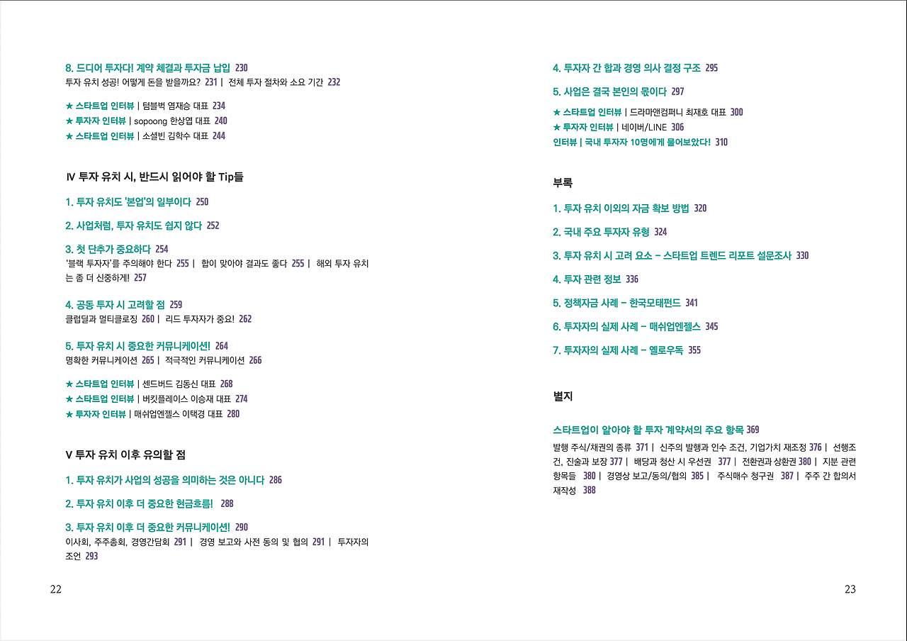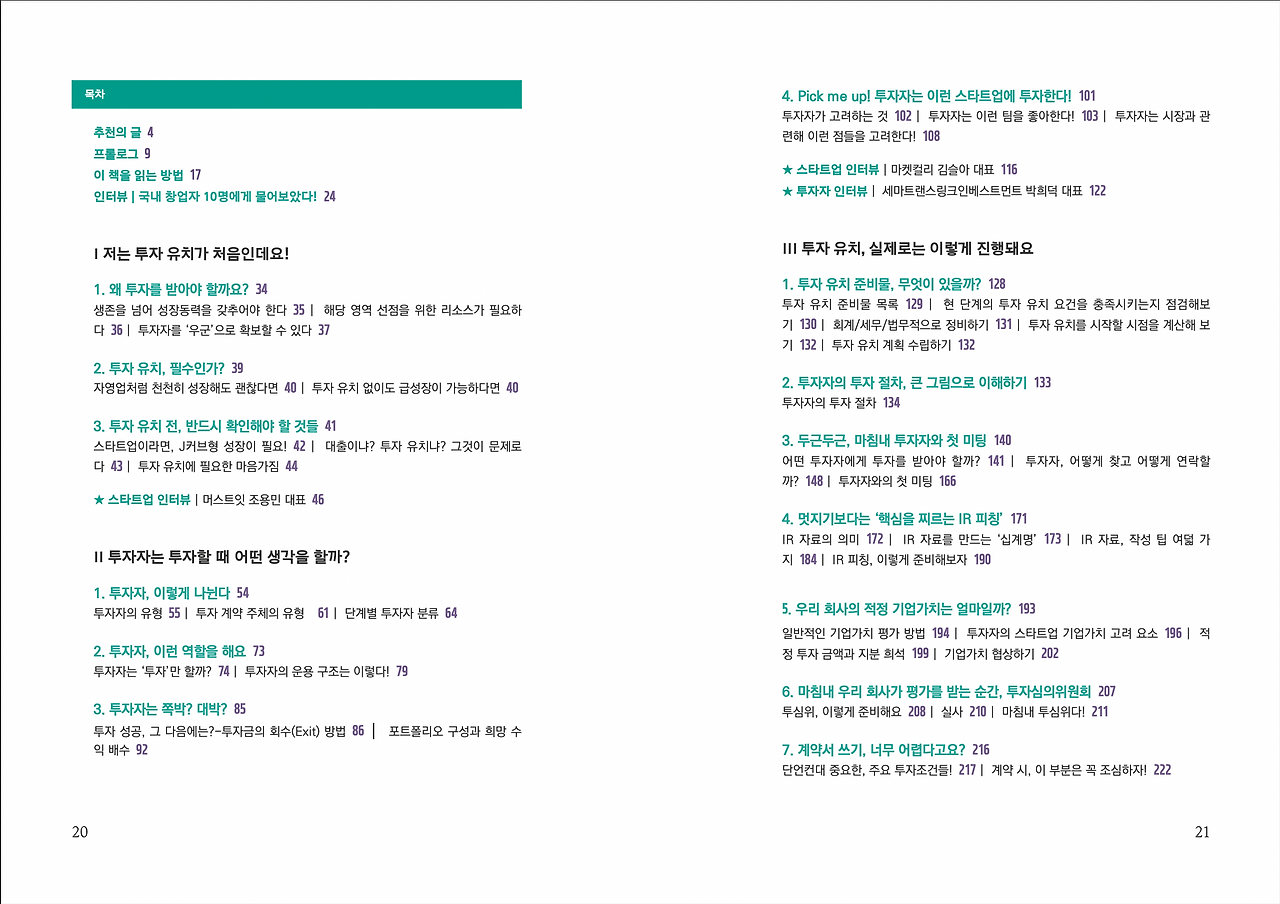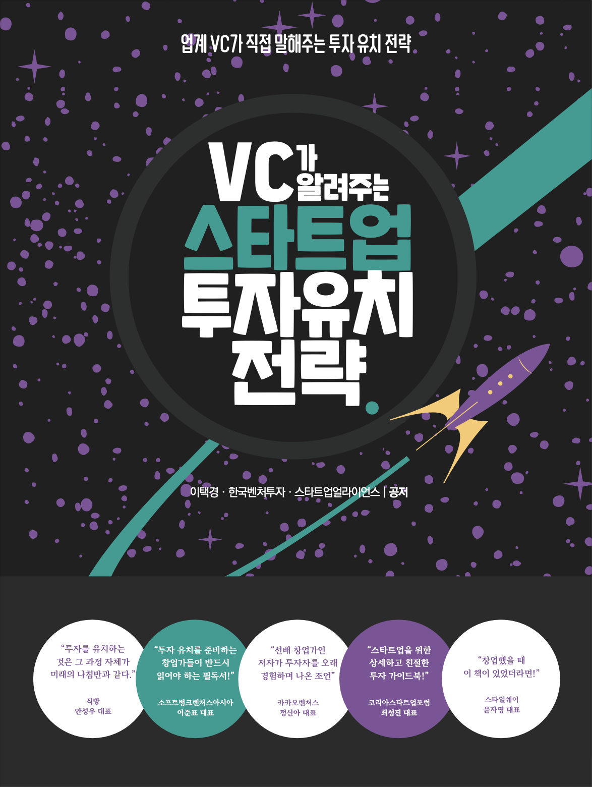 스타트업이 성장 과정에서 겪는 수많은 시행착오를 조금이라도 덜어주는 것이 투자자로서의 역할이라고 생각합니다. 이 책이 성공적인 투자유치에 대해 명쾌한 해답을 줄 수는 없지만, 투자유치에 힘들어 하는 초기 스타트업에게 조금이라도 도움이 되었으면 하는 바람입니 다.