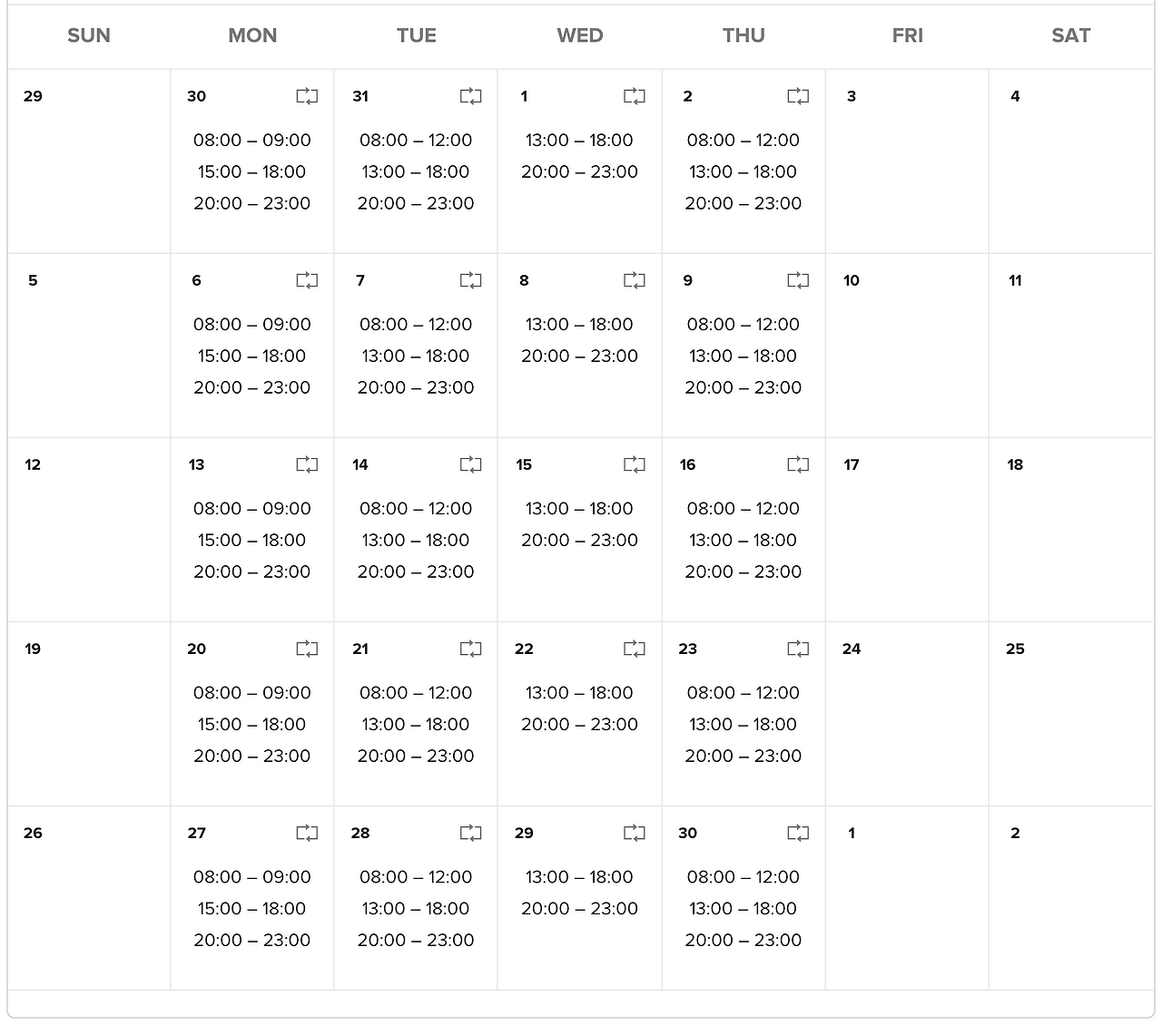 기본적으로 일정들의 앞뒤 시간 여유를 잡고 부킹이 들어오도록 하는 세부 설정도 할 수 있고요. 또 Lunch/Dinner 같은 유형의 일정은 하루 한 개만 잡아야 건강에 해롭지 않을 테니, maximum number of this event 를 한 개로 제한할 수도 있습니다.