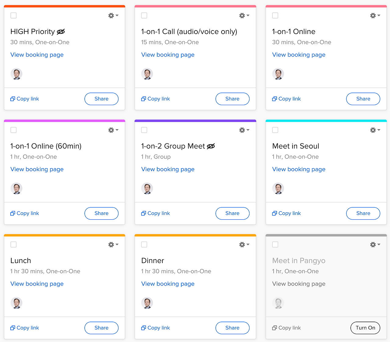 쓰는 법은 그리 복잡하지 않습니다. 일정 타입을 몇 개 생성해 두고, 그 중에서 고를 수 있게 "나의 프로필 링크" 에 해당하는 URL 을 전달해 주면 됩니다. 예를 들면, [calendly.com/인배의빈시간을잡을수있는링크] 한 줄짜리 웹주소.