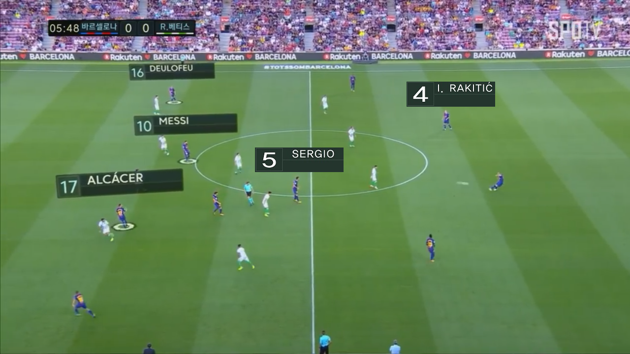 중원의 조합을 최소 4명 최대 6명까지 위치해 가면서, 가장 눈에 띄게 보였던 장면은 라키티치의 위치였다. 더블 볼란치의 형태로 부스케츠가 평소의 모습보다 좀 더 전진된 플레이를 가져가면서 라키티치의 전진 패스 비율이 평소보다 많았던 것이 이번에 영입된 파울리뉴의 약점도 많이 상쇄시켜줄 것이라고 기대된다. 또한 경기 패스 맵을 보면 알 수 있듯이 라키티치 부스케츠 메시 3명의 패스의 형태가 엔리케 시절 이니에스타 라키티치 간의 패스가 극히 적었던 부분과 매우 상반된다.