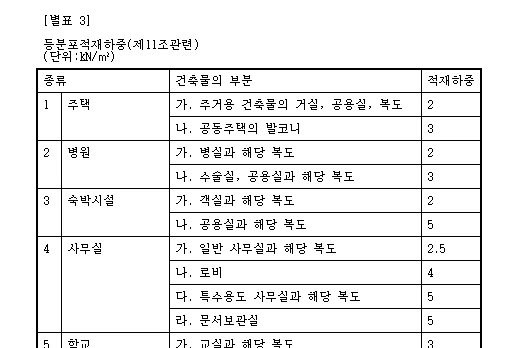 건축물의 구조기준 등에 관한 규칙(건설교통부령 제433호)에서 건축물의 용도별로 적용하는 등분포적재하중 기준을 확인할 수 있습니다. 주택의 주거용 건축물 거실, 공용실, 복도는 2 kN/㎡, 공동주택의 발코니는 3kN/㎡로 규정되어 있습니다. 정원 및 집회 용도로 만든 옥상은 5 kN/㎡입니다.