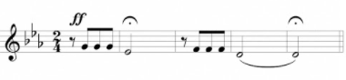 베토벤의 5번 교향곡 ‘운명’은 위와 같이 유명한 주제 동기와 함께 시작된다. 어느 날 이 테마의 뜻을 묻는 제자에게 베토벤은 “운명은 이와 같이 문을 두드린다”라고 답했다고 한다. 마치 “폭풍우가 휘몰아치는 하루”와도 같은 삶을 살았던 음악가는 이 곡을 작곡할 1807년 당시에는 거의 귀가 들리지 않는 상태였다.
