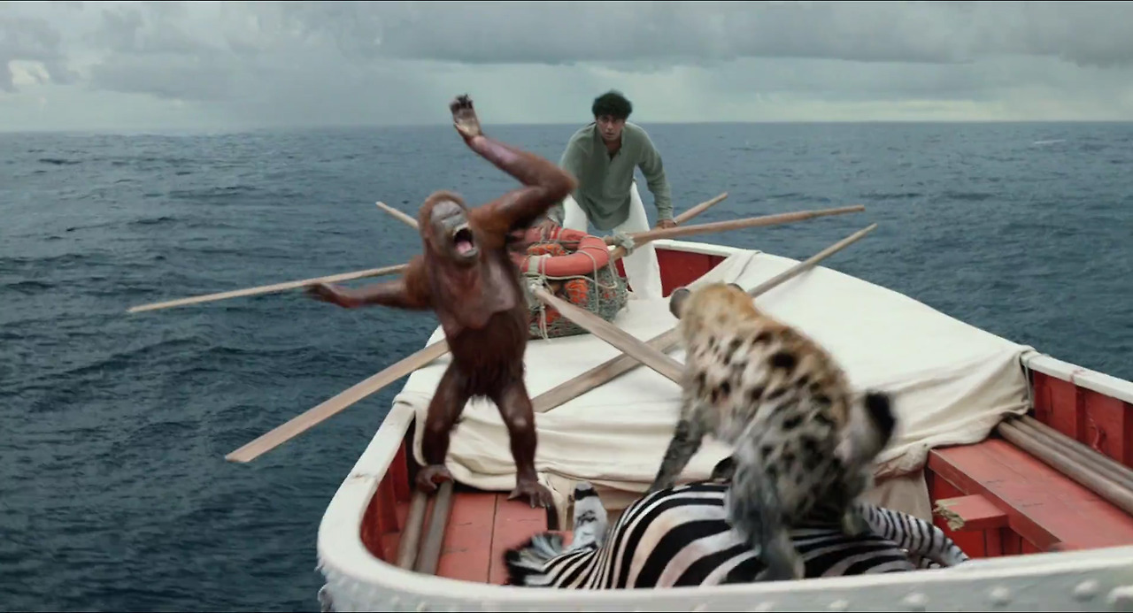 짐승들은 오래 살아남지 못합니다. 얼룩말을 노린 하이에나에게 저항하던 오랑우탄은 하이에나에게 살해되고 하이에나 또한 벵갈 호랑이에게 죽습니다. 그리하여 남은 건 리처드 파커와 파이 둘 뿐입니다. 구조의 희망이 보이지 않는 망망대해에 결코 공존하기 어려울 둘은 표류하며 생존의 사투를 벌입니다.