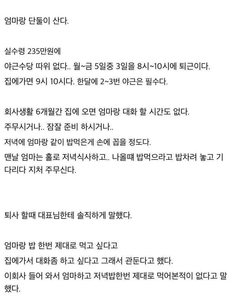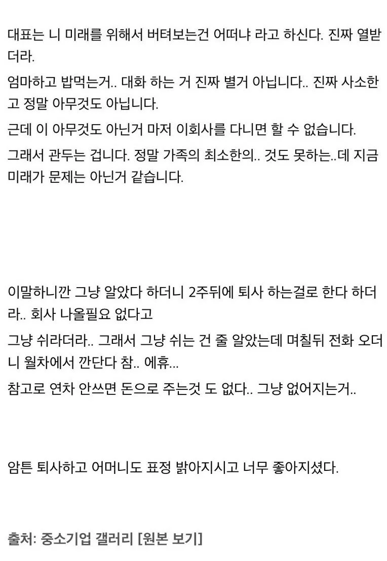 그런 직장이라는 공간이 정작 내 가정에게 문제가 생겼을 때 내가 그곳에 가지 못하게 한다는 것에 직장에 대한 신뢰가 무너지게 된 것 같았어요.
