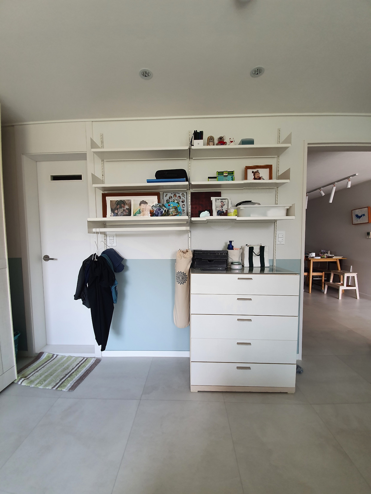 그런 이웃들을 두고 이사를 결정했다. 신랑의 출퇴근과 아이들의 중학교 문제가 제일 큰 화두였다. 다른 동네로 향하는 마음은 무거웠지만 또 이사 가기로 한 곳에 적응해야 했다. 적응... 그런데 어쩌다 보니 이사 갈 집이 평수가 좁아졌다. 넓은 집으로 넓혀가는 것은 상관없지만 좁은 집으로 가는 일은 가히 대환장 파티였다. 모두 다 같이 가면 집은 포화상태로 터져버린다. 줄자를 들고 거실과 방 그리고 화장실의 가로 세로 높이를 재고 집의 모든 물건들의 크기를 재어서 시뮬레이션해보았다. 어플들도 있지만 종이 한편에 그렸다가 지웠다가 다시 그렸다가 하는 것이 일이었다. 소파도 냉장고도 책상도 모두 다 가지고 갈 수 없었다. 어쩔 수 없이 포기하는 것들과 가지고 가야 하는 것들을 냉정하게 구분해야 했고 중고거래 어플을 통해 정리하고 또 새로운 물건을 사야 했다. 물건을 사야 할 때 가장 우선 되어야 할 점은 공간의 활용이었는데 공간의 5-10센티도 소중해서 맞춤장이 꼭 필요했다. 오래 살 예정인데 알루미늄 새시도 바꿔야 했다. 공간 5-10센티에 연연하다 보니 여기 조금 저기 조금은 어느새 큰 공사가 되어버렸다.