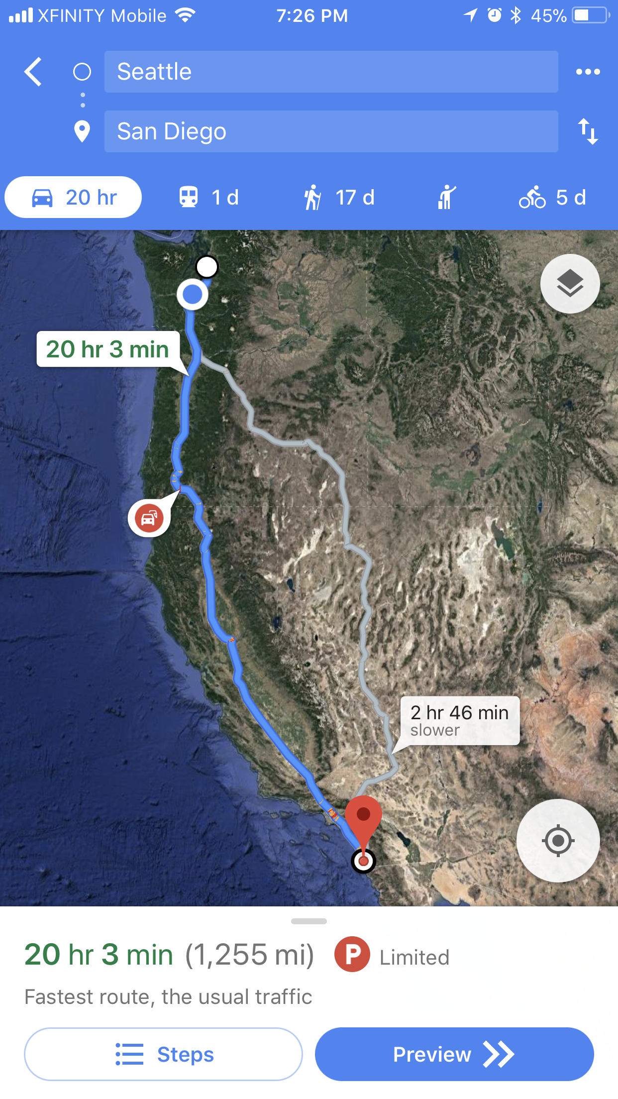 나와 남편, 그리고 한국에서 우리와 함께 여행하고자 온 대학 후배가 여행의 동반자가 되었다. 우리는 서부 북부로부터 남부로 가는 루트를 짰다. 도시 기준으로 시애틀>포틀랜드>샌프란시스코>산타 바바라>로스 엔젤러스>라스 베가스>샌디에이고, 주(States) 기준으로는 워싱턴, 오레건, 캘리포니아, 네바다, 애리조나까지 총 5개 주를 오직 차로 횡단했다. 참고로 시애틀부터 샌디에이고까지 거리는 약 2020km이고 쉼없이 운전했을 때 약 20시간이 소요된다.