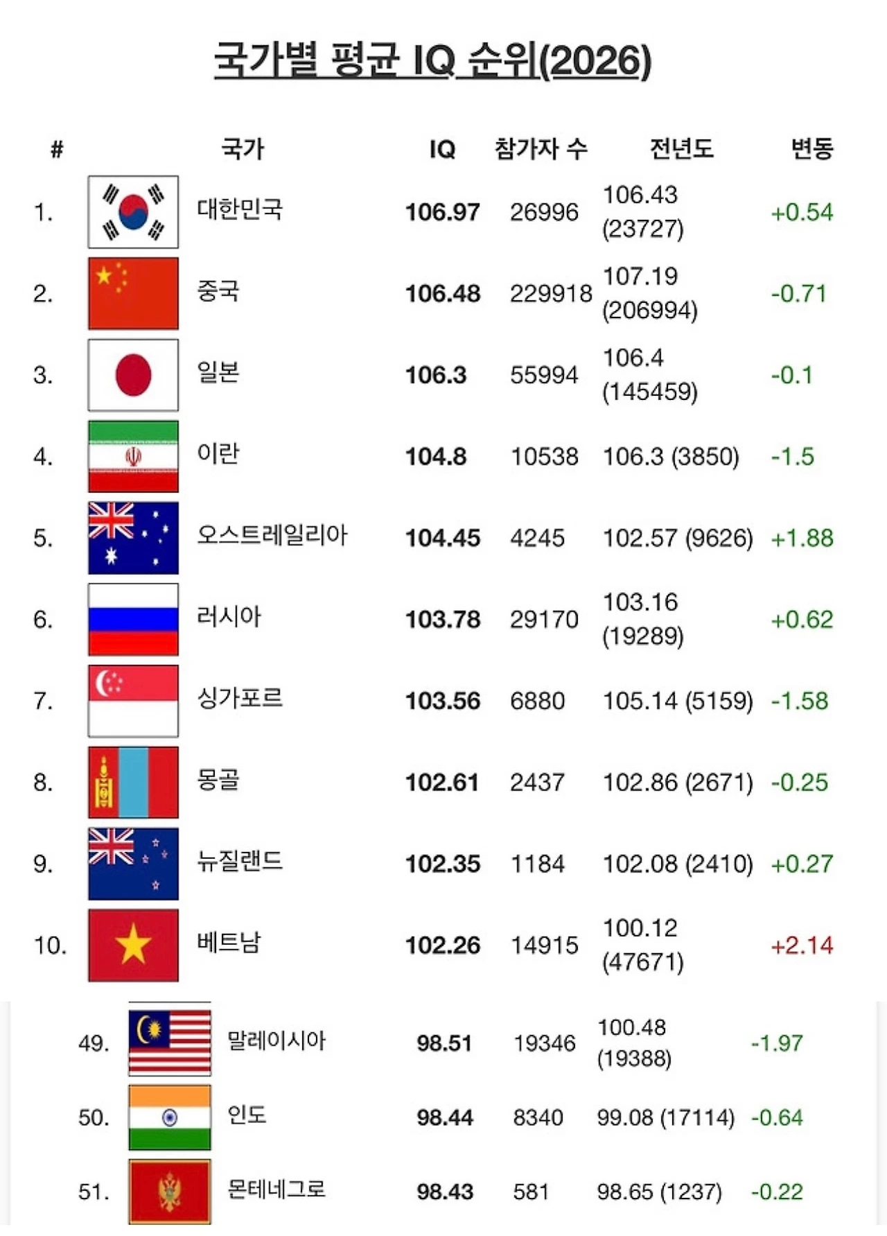 세계 아이큐 평균 순위를 보면 한국은 1위권(평균 약 106 수준), 인도는 50위권(평균 약 76~82 수준으로 추정된 연구도 있음)이라는 자료가 있다. 이 숫자만 보면 단순 비교가 가능해 보인다. 하지만 국가 단위 평균 IQ는 교육 접근성, 영양 상태, 조사 방식, 표본 편차에 따라 크게 달라진다. 절대적 우열의 지표로 보기에는 한계가 명확하다.