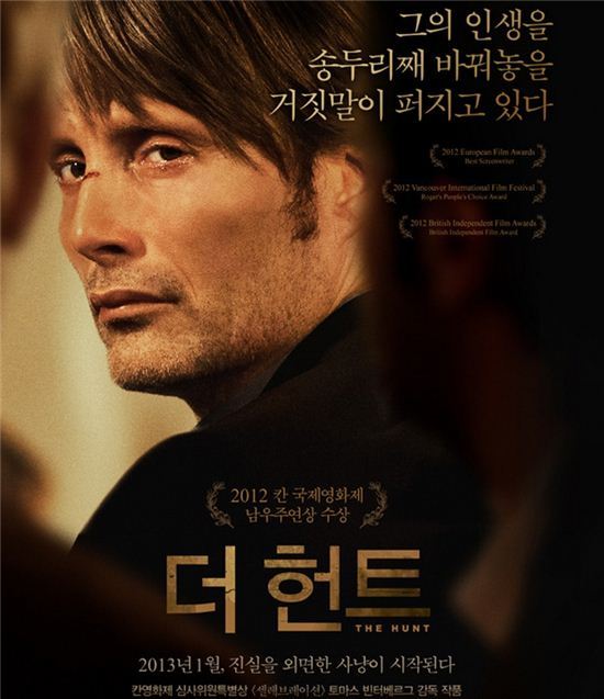 개봉당시 관람하지 못했다가 최근에야 찾아보게 되었다. 주연배우 '매즈 미켈슨'이 칸영화제 남우주연상을 받으며 유명해졌다. 이야기는 토마스 빈터베르 감독이 직접 아동학자에게서 입수한 실제 자료를 바탕으로 했다. 시골 마을 유치원 교사 '루카스'가 어느 소녀의 거짓말로 인해 억울한 누명을 쓰고 무고를 당하는 내용이다.