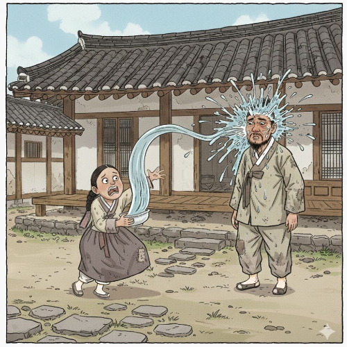 - 아부지 목마르실까 봐 물을 가져오다가, 그만 발이 제멋대로 꼬였네여. 송구해유, 아부지!