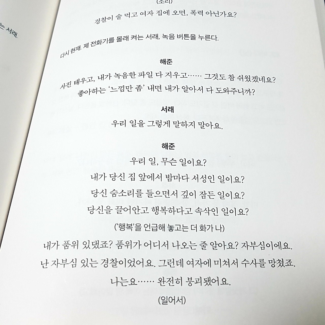 해준은 수사에 임할 때는 똑바로 제대로 보려고, 피곤한 눈에 인공눈물을 넣던 남자였다. 그런 해준이 사랑에 미쳐서 수사를 망쳤으니 붕괴될 수밖에. 자부심이 있어서 품위 있던 형사 해준은 진실을 알았지만 자부심을 버리고 진실을 덮기로 한다. 서래에게 범행에 쓰인 할머니의 휴대전화기를 건네며 아무도 찾지 못하게 바다에 버리라 한다. 붕괴되어 무너진 남자는 배신감에 부르르 떨면서도 결국 마지막까지 사랑을 버리진 못했다.
