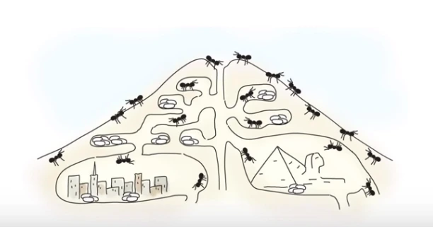 개미는 사람에 비해서 그렇게 영리하지 않습니다. 개미들은 두 가지 일을 합니다. 그들은 무거운 것을 높이 들 수 있고, 흔적을 남기고 따라다닙니다. 그래서 다른 개미가 어디로 가는지 알 수 있고, 따라갈 수도 있고, 자신의 흔적을 남기며 갈 수도 있습니다. 그래서 모든 개미들은 흐름으로 이동하죠. 이 흐름 때문에 개미들은 엄청난 개밋둑을 쌓을 수 있고 이런 건축물을 만들 수 있습니다.