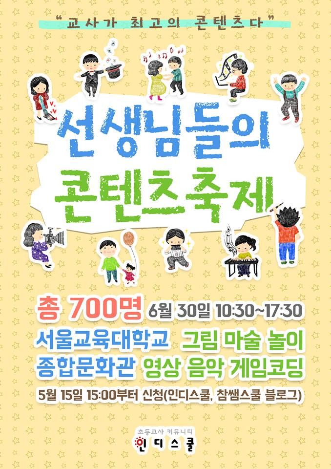 인디스쿨 미디어콘텐츠팀장인 참쌤을 중심으로 올해로 3년째 열리고 있는 이 축제는, 과거 '그림 축제'에서 올해 특별히 '콘텐츠 축제'로 한걸음 더 나아갔습니다. 인디스쿨 공식 교사모임 중 4개 단체(참쌤스쿨, 몽당분필, 스텝매직, 전국초등음악수업연구회) 그리고 스티브코딩과 같이놀자까지 6개 단체에서 5개 공연과 20개 강좌를 준비했고, 현역 교사들과 예비교사인 교대생을 포함해 약 700명을 대상으로 18개의 강의실에서 실습 중심의 다양한 연수가 이루어졌습니다. 교사모임팀 선생님들의 콘텐츠, 역량에 감탄했고, 노고에 감사하게 되었고 내년의 축제를 기대하게 되는 시간이었습니다. 이 날 받은 영감으로 많은 선생님들께서 2학기 때도 최고의 콘텐츠로서 활약해 주시겠죠?