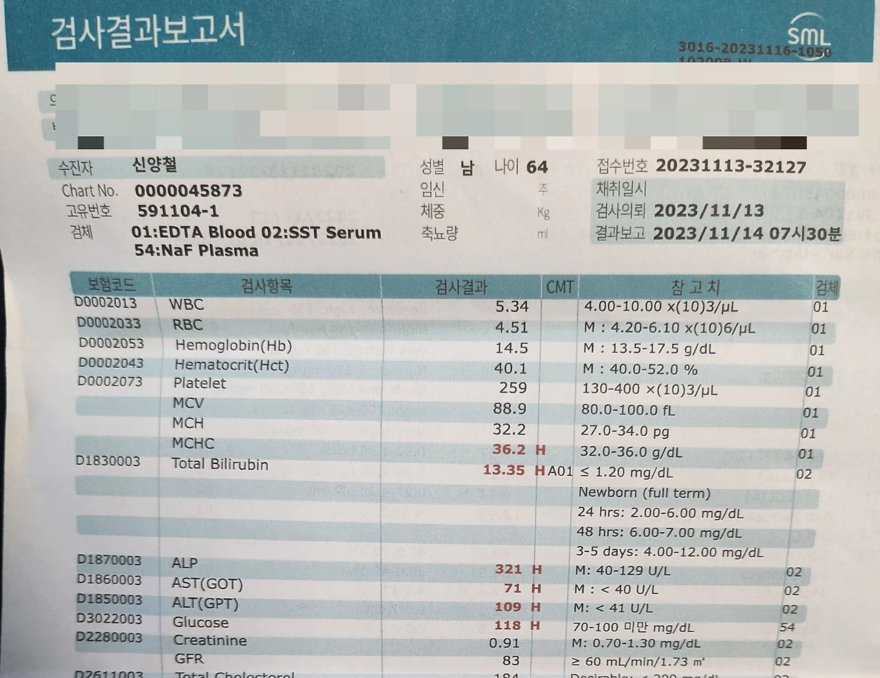 전화를 끊고 몇 분 뒤 아버지는 피검사 결과지를 보냈다. 건강검진 때 조금씩 높았던 각종 간수치는 정상 범위를 한참 벗어나 있었다. 특히 'Total Bilirubin'이라는 것은 정상의 10배 이상 높아져 있는 상태였다. 이제는 빌리루빈 수치가 '황달'을 의미하고 당시 상태는 초응급이라는 것도 해석할 수 있게 됐지만, 그때도 예삿일이 아니라는 불길함이 엄습했다.