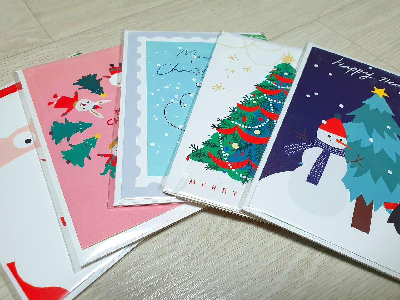 그래서 아쉬운 마음을 조금이나마 풀어주려고 크리스마스트리도 꾸미고 오랜만에 친척들 한테 보낼 크리스마스 카드도 샀다. 할아버지, 외할아버지/외할머니, 큰아빠/큰엄마, 이모부/이모, 이종사촌들 아이들이 써야 할 카드도 많다.