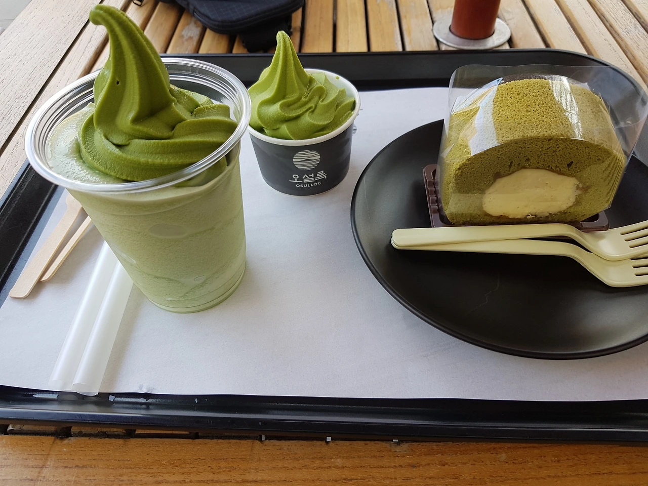 맛있는 식사를 하고 디저트도 먹고 좀 쉴 겸 근처의 오설록으로 향했다. 오설록에서 우리가 먹을 차와 선물할 차 등을 구매하고 오설록의 시그니쳐 녹차 오프레도와 아이스크림, 롤케익을 먹었다.