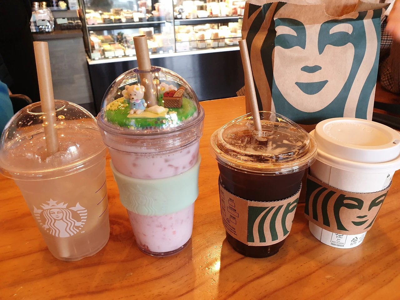 아침 피곤을 물리치기 위해 커피 한 잔 먹으러 숙소 앞의 스타벅스로 들어갔다. 딸내미가 텀블러가 마음에 들었는지 사달라고 해서 사주고 네 명이서 한 잔씩 마시는 것을 고르고 나니 뭐 식사값만큼이나 나왔다.