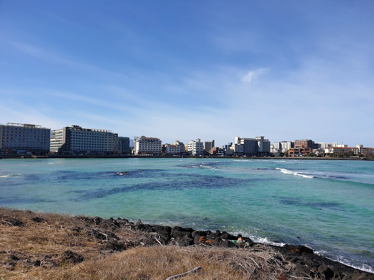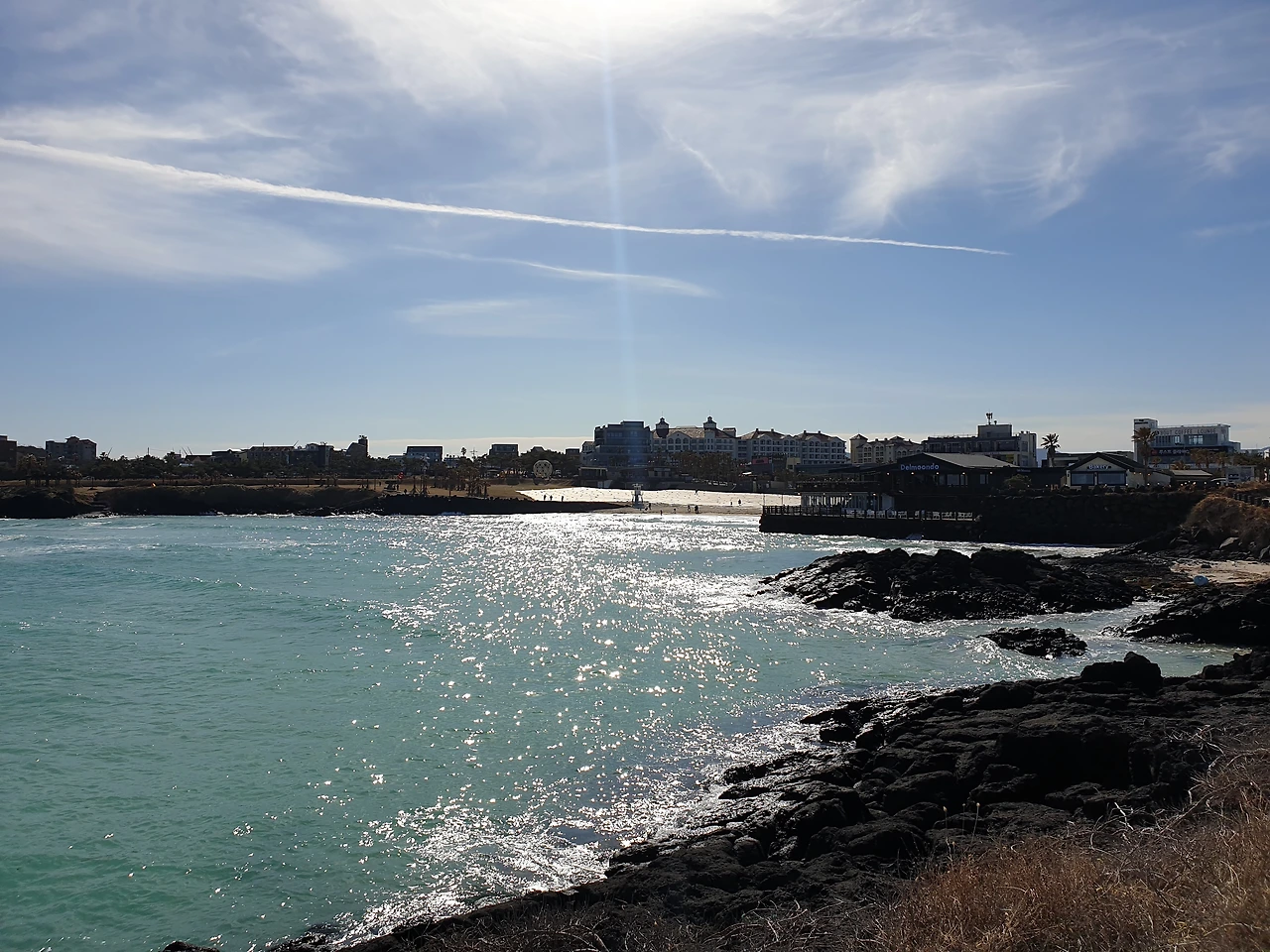 1시간여를 버스를 타고 도착한 함덕에서 따뜻한 커피 한 잔. 거의 초여름 같았던 어제와 비교해서 기온이 좀 떨어졌다. 실내에서 커피를 마시다가 가까이에서 바다를 보고 싶어 함덕의 유명한 델문도 카페 옆 바다가로 갔다.