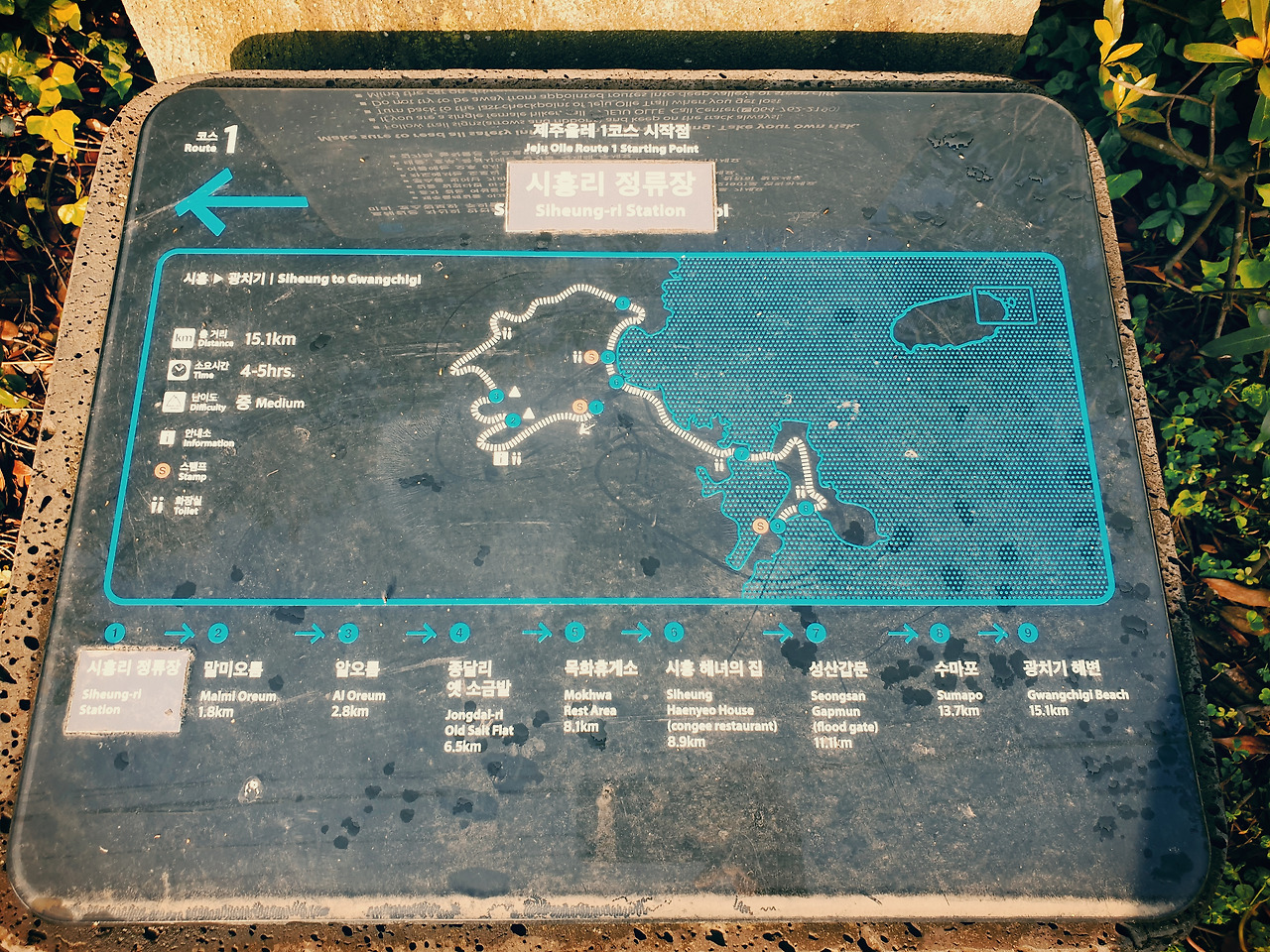 가슴 가득 설렘을 앉고 동쪽으로 향했다. 올레길 1코스는 시흥초등학교에서 광치기해변까지 총 15.1km 코스이다. 이번에는 차를 렌트했기에 주차에도 신경을 써야 했다. 제주 전역이 주차장은 잘 조성되어 있지만 미리 어플 지도로 확인해 본 결과 시작점인 시흥초등학교 주변은 주차할 곳이 마땅하지 않았다. 그래서 도착지인 광치기 해변 주차장에 주차를 하고 순환버스인 201번 버스를 타고 출발점으로 향했다.