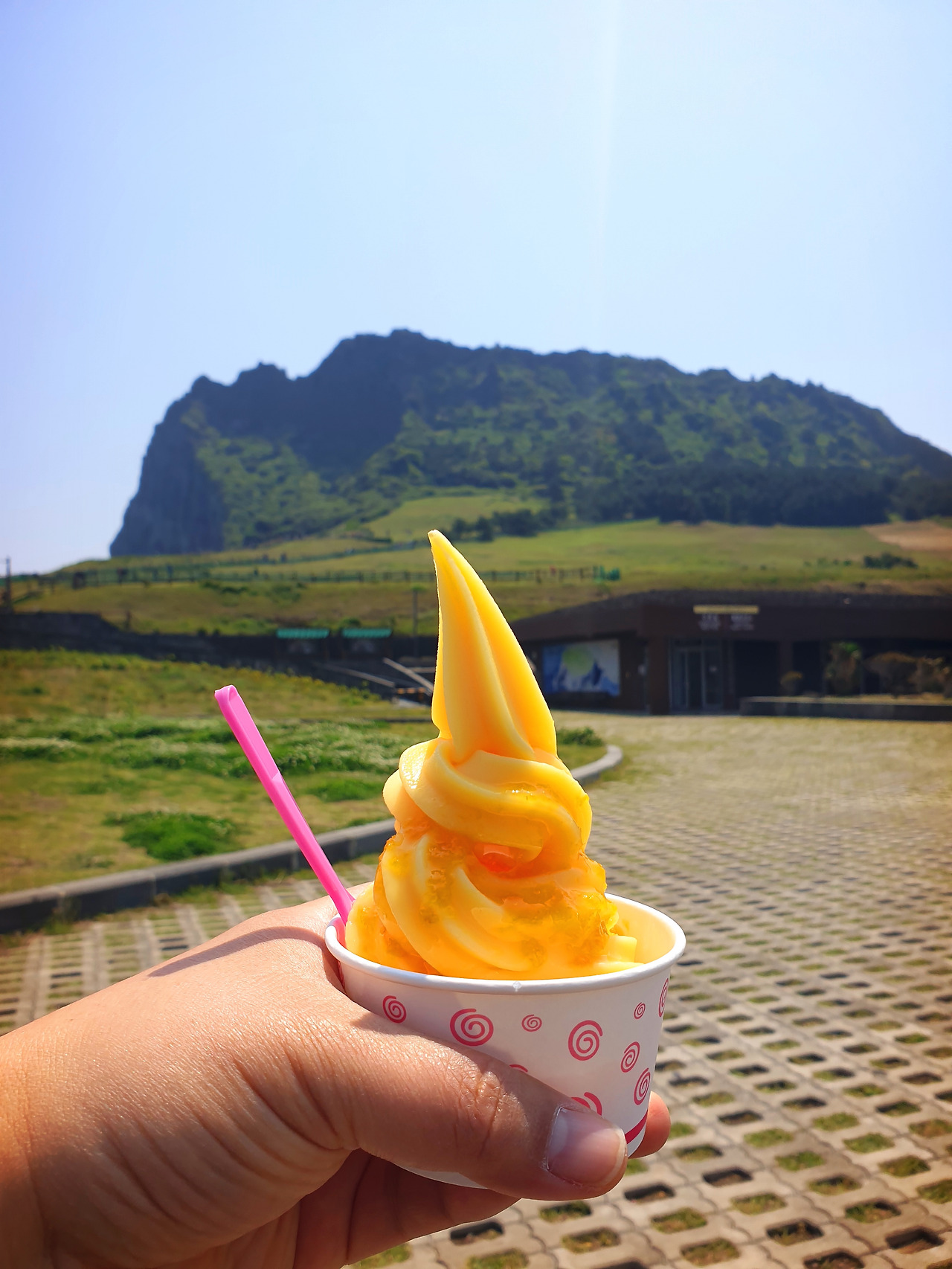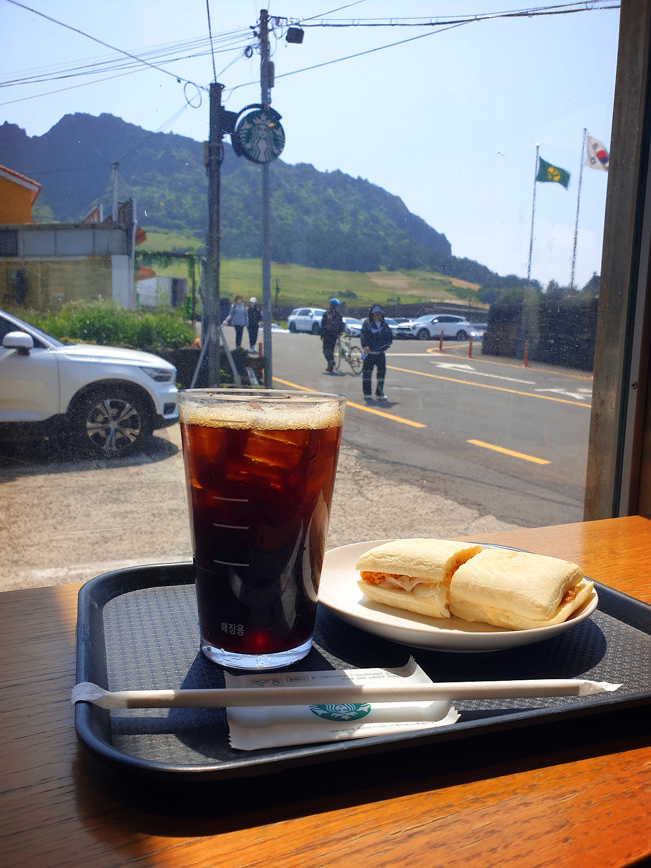 성산일출봉을 보면서 계속 걸어가다 보니 어느덧 일출봉에 도착했다. 이제 좀 쉬어가야겠다 싶어 스벅에 들어가서 아메리카노 한 잔 마시고 아이스크림까지 당 충전을 했다.
