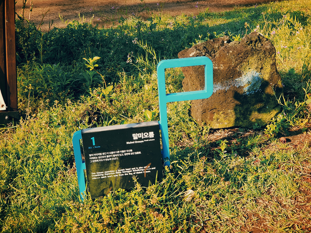 올레길을 표시해 주는 리본과 화살표, 간세가 보이는데 이게 뭔가? 시작하자마자 오름이 시작된다. 말뫼 오름, 그리 높은 오름은 아니지만 시작하자마자 연이어 나온 두 개의 오름에 난 벌써 땀범벅이다.