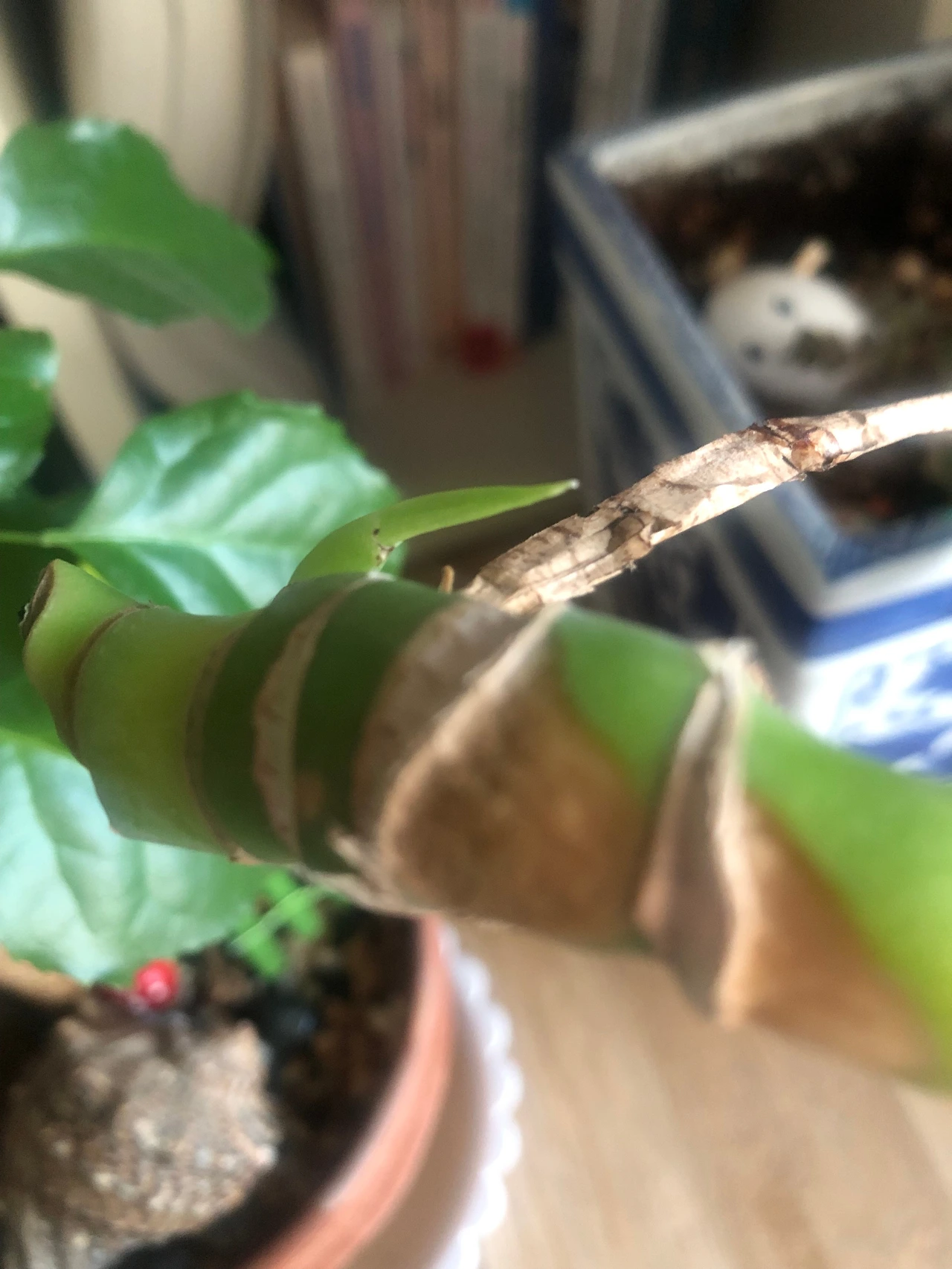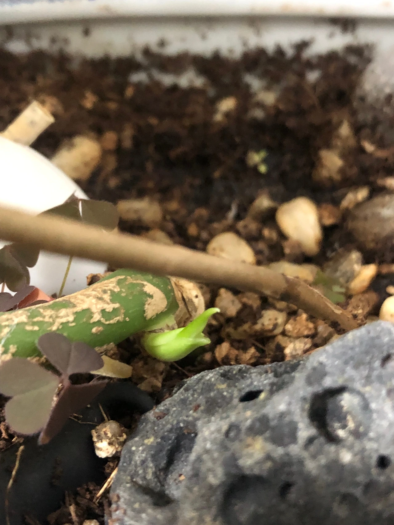 희끄무레한 색으로 봐선 잎은 아닌 거 같은데 뿌리라기엔 좀 더 뾰족한 느낌이 들어 좀 더 지켜보기로 했다. 버리는 것도 일인데 잘 되었다 싶은 마음도 있었다.