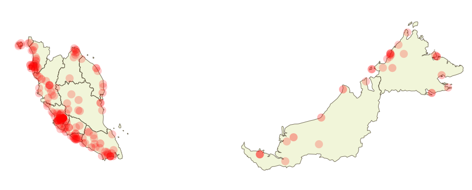 말레이시아 인구 밀도 기준 / 서 말레이시아 중간이 쿠알라룸푸르 및 끌랑 밸리고, 가장 아래 빨간 점이 강하게 나타난 곳이 조호르 주다.