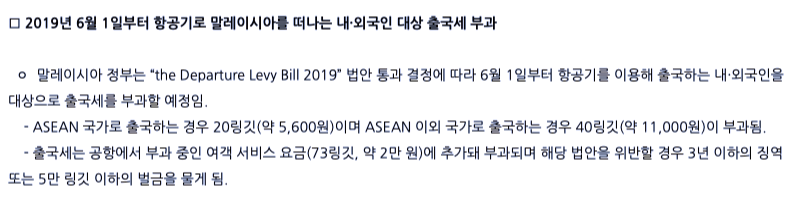 또 달라지는 것이 있다. 바로 '출국세'. 관광세는 이미 적용이 되어 있어서, 호텔 숙박을 할 경우, 1박당 10링깃씩 관광세가 붙곤 했다. 2017년 9월쯤이었나로 기억하니까, 이미 2년이 다 되어간다. 그런데 거기에 더해, '출국세'를 받겠단다. 얘기인즉슨, 말레이시아 공항을 출발해 항공기로 말레이시아를 떠나는 모든 대상에게 출국세를 부과하겠다는 것이다. 20링깃부터~40링깃까지 다양한데, 이는 좌석 등급에 따라 다르기도 하다. 이코노미는 20링깃, 비즈니스는 40링깃, 이런 식으로 다를 수 있단 얘기다.