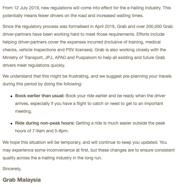 택시 운행에 대한 충돌이 한국만 있는 건 아니다. 말레이시아도 마찬가지. 그동안 그랩 서비스에 대한 기존 택시 운전사들과 그랩과의 충돌은 꾸준히 있어왔고, 정부에서도 이를 어떻게 처리해야 할지 곯머리를 앓아왔다. 결국 내가 보기엔 기존 택시운전기사들의 '승리'라고 보이지만, 올해 4월, 모든 그랩 운전자가, 정기적인 차량 점검, 운행 교육, 신체검사, 등록증 취득을 해야 하는 의무법 조항이 통과되고, 7월 12일부터 이 법이 실효화 되면서, 일반 그랩 기사 25만여 명이 해당일까지 이를 반드시 이행해야 하는 상황에 처하게 됐다.