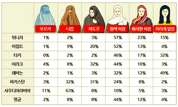 무슬림 율법이 더 강한 나라들에서는 보통 '여성을 보호해야 하는 차원'에서 부르카, 니캅 등을 입어야 한다고 말한다. 물론 허용되는 노출 수준은 나라마다 다르지만, '신께서 창조하신 인간 중, 가뜩이나 아름다운 여성의 신체가 노출되었을 때, 남성의 욕망으로부터 벗어나기 쉽지 않기 때문에 신체 모두 가려야 한다'는 그들의 기준은, 종교적 해석에서는 자유로울지 모르나, 21세기적 '평등, 인권, 자유' 등을 외치는 작금의 세태에서는 어떻게 이해할 수 있는 부분인지 '무슬림'이 아니면 사실 고개를 '갸우뚱'하게 될 법도 하다. 여성의 자전거 타기, 운전을 오랫동안 금지해왔고, 여성은 참정권도 없었던 사우디 아라비아에서 니캅이나 부르카를 입어야 한다는 의견이 74%로 나오는 건 사실 놀랄 일도 아니다.
