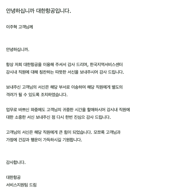 "너무 감사합니다. 제가 어제 꼭 입어보고 살걸 그랬어요. 귀찮은 일인데 선뜻 바꾸어 주셔서 감사합니다. 그리고 이 직원이 친절하게 응대해 주어서 감사하다고 꼭 말해주세요. 그리고 여기.."