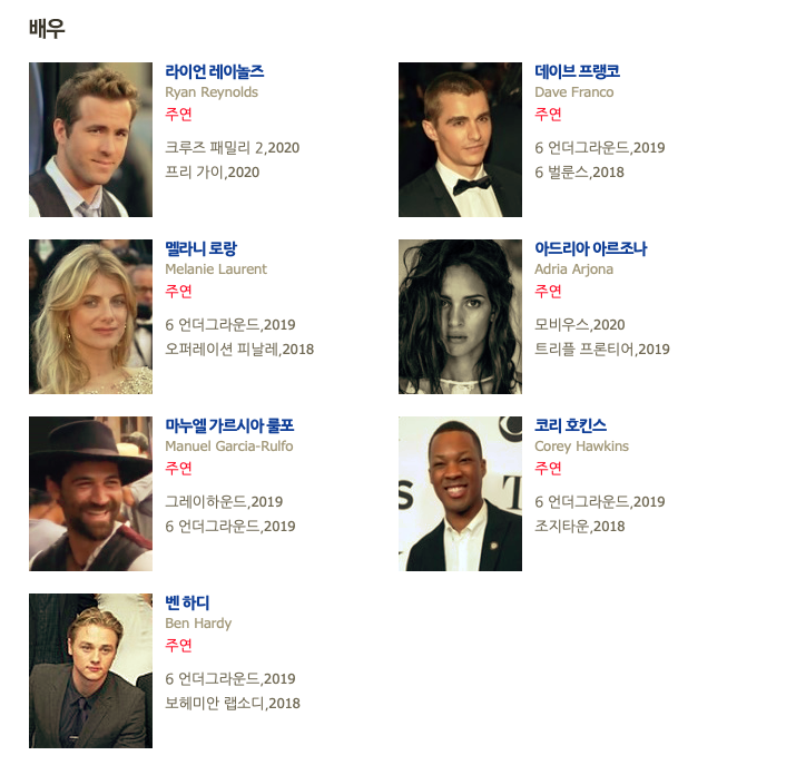 세상에 존재했던 모든 흔적을 지우고 대의를 위해 싸우기로 모인 6명의 '고스트'. 하나 같이 매력이 철철 넘친다. 라이언 레이놀즈는 라이언 레이놀즈를 연기했고, 멜라니 로랑, 아드리아 아르조나는 매순간 강렬하면서 카리스마가 흘러 넘친다. 마누엘 가르시아 룰포, 코리 호킨스, 벤 하디, 데이브 프랭코도 각자의 페르소나를 찐하게 보여주며 각기 다른 여섯 명의 혹은 일곱 명의 매력을 충분히 발산한다.