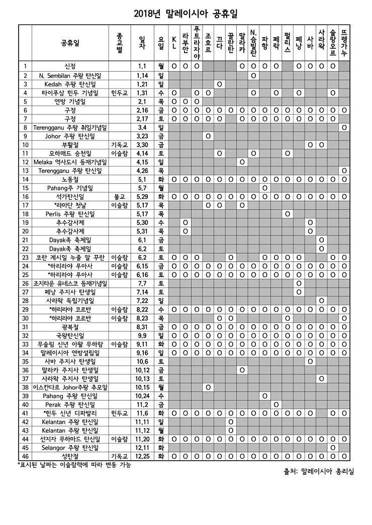 2018년 기준 말레이시아 휴일