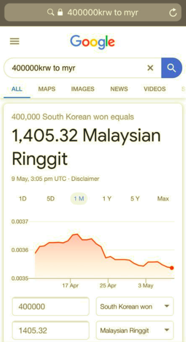 KRW는 '코리안 원'이라는 건 다 아실 테고, MYR은 MalaYsia Riggit의 약자다. 보통 쇼핑몰에선 RM이라고만 쓰여 있다 (Riggit Malaysia의 약자)