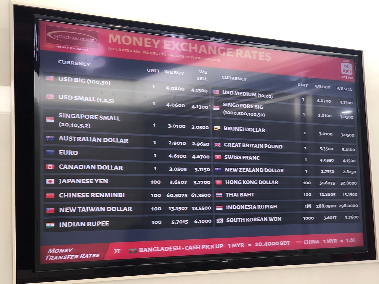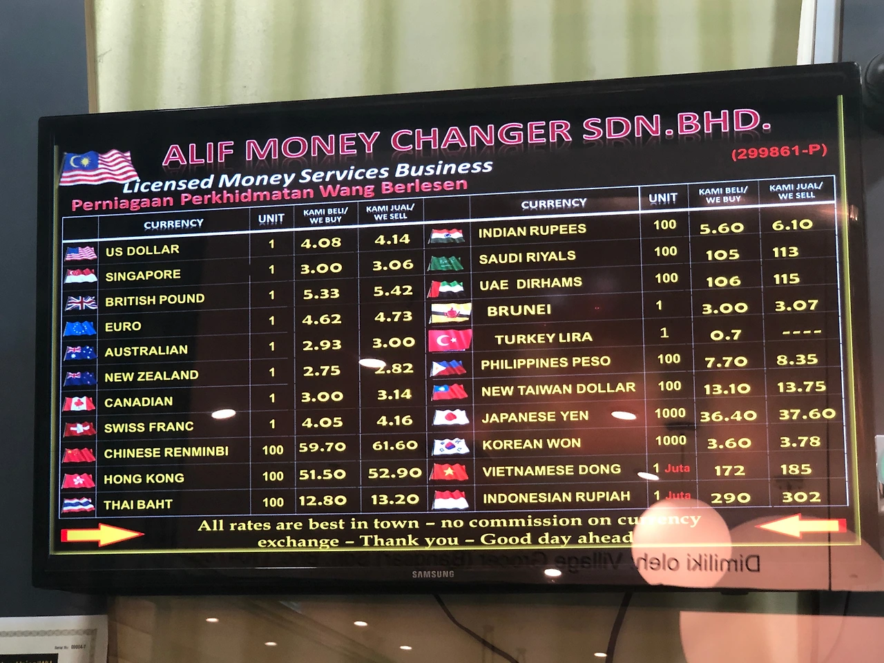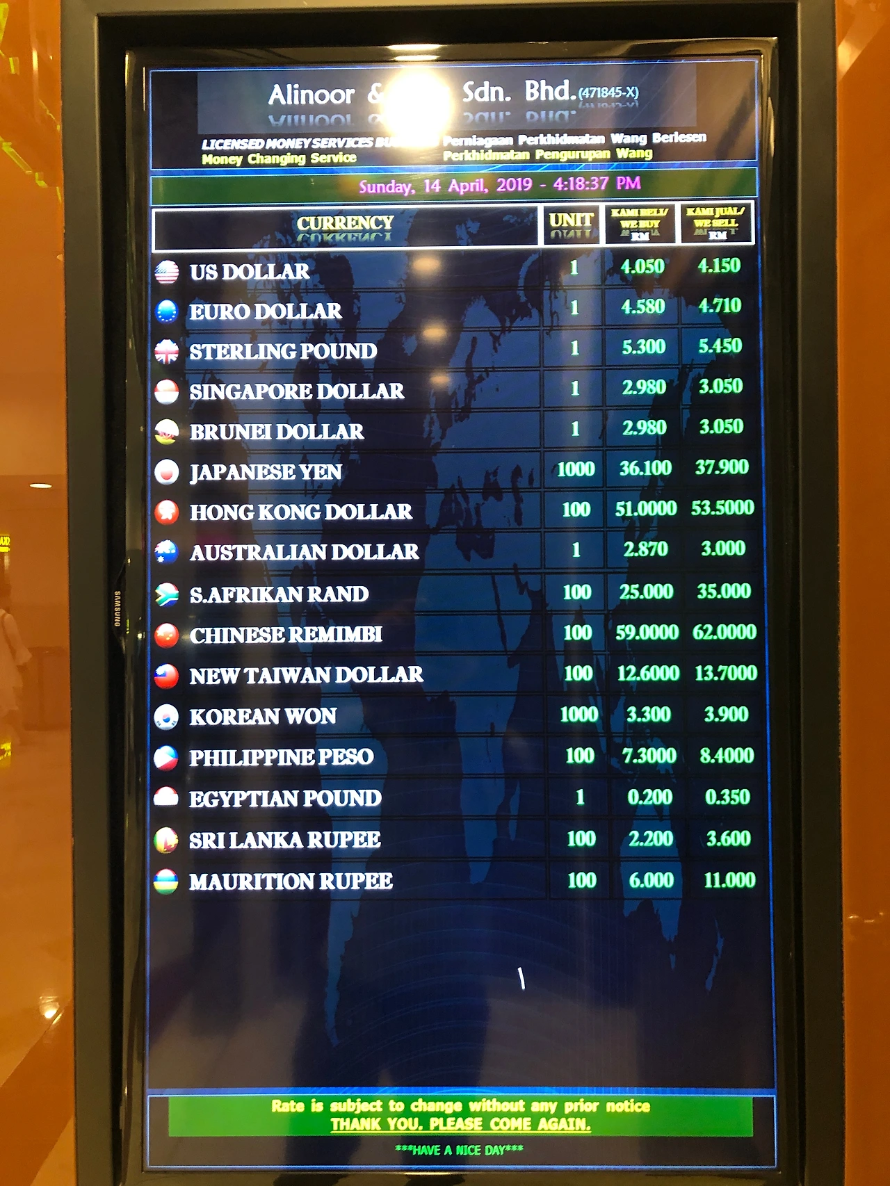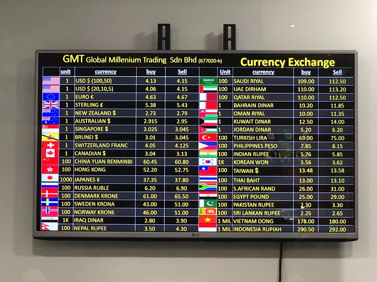 다시 위로 올라가서 내가 올린 사진을 자세히 본다면 쉽게 알 수 있지만, 환전소 환율이 제각각이다. 맨 아래 사진을 제외하고 모든 사진은 같은 날 찍혔는데, 1달러 기준 환율이 3.9링깃에서 4.08링깃까지 차이가 난다. 한화는 어떤가. 1,000원 기준 3.3에서 3.6링깃까지 차이 난다. 소액을 환전하는 사람에겐 크게 문제없어 보일지라도, 큰 금액을 환전하고 싶다면 얘기가 달라진다. 5%에서 거의 10%까지 차이가 나는데, 10만 원을 바꾼다 해도 1만 원의 차이며, 100만 원을 바꾼다면 자그마치 10만 원이나 차이나는 금액이기 때문이다.