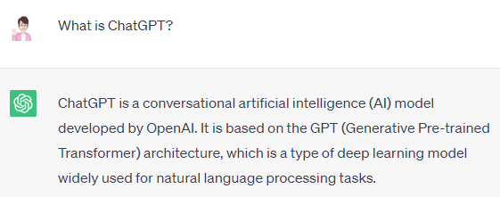 What is ChatGPT?라는 프롬프트(prompt)에 대한 ChatGPT (GPT-3.5)의 응답