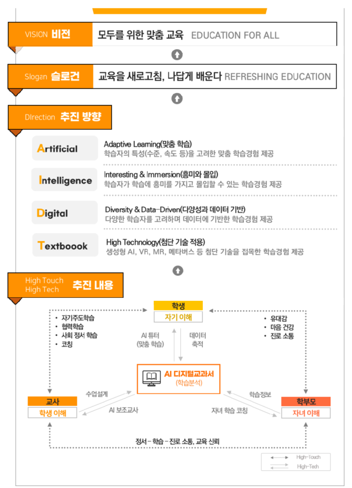 2023년 11월 한국교육학술정보원(KERIS)에서 발간한 ‘인공지능(AI) 디지털교과서 개발 가이드라인’(이하 가이드라인)의 첫 장에서 가장 먼저 등장하는 문구와 이어서 제시된 ‘AI 디지털교과서 비전 체계도’에서 밝힌 비전에 쓰인 문구이다. 학생 대상 1인 1기기 전면 보급과 맞물려 앞으로 우리 교육의 모습을 크게 바꿀 것으로 예상되는 AI 디지털교과서와 교육에 관해 이야기하려고 한다.